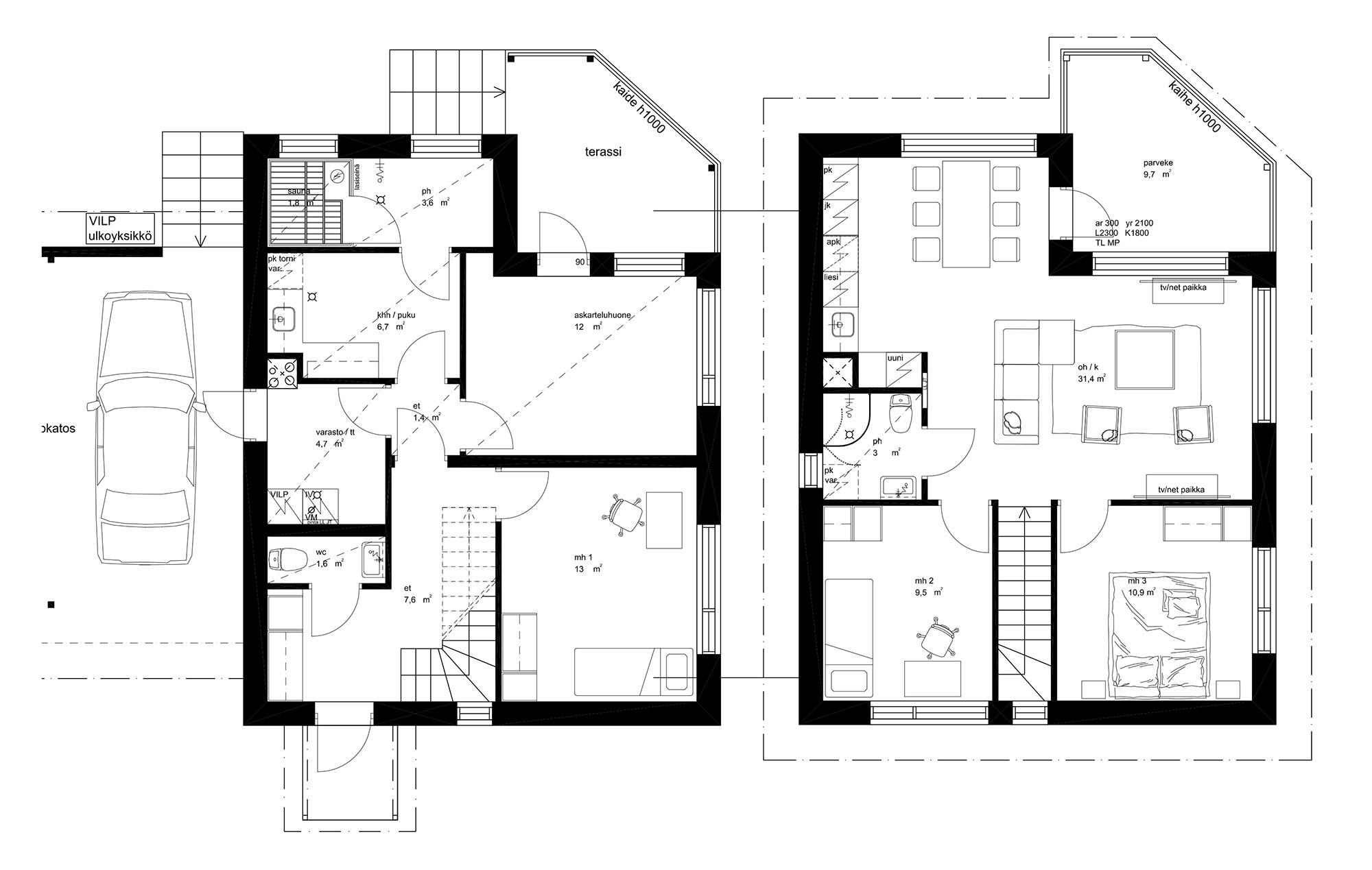 Alakerran katettu terassi on myös lasitettavissa optiolla, joka tuo lisää tilan tuntua ja suojaa sään vaihteluilta.
